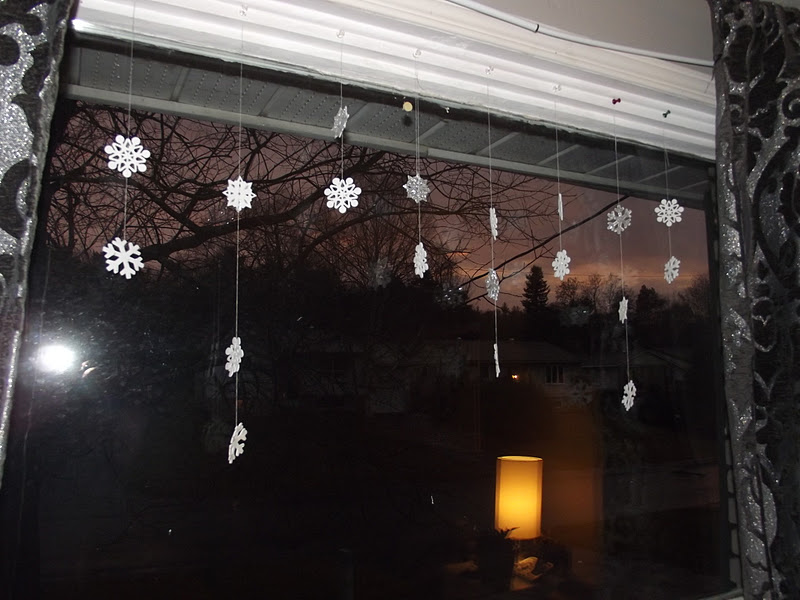 I even glitterized them. Some of them i left plain white, Some of them i did silver glitter and some have shimmery white glitter on them. I choose to alter them in designs and height but attaching them with basic white sewing thread. I heard that basic white sewing thread doesn't reflect a glare like fishing line would. This was a very simple project but adds that little something to my windows for the holidays.